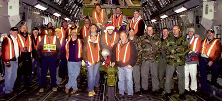 Kevin Mulligan of CDK with NASA and USAF personnel inside a C17 aircraft after a successful test loading. |